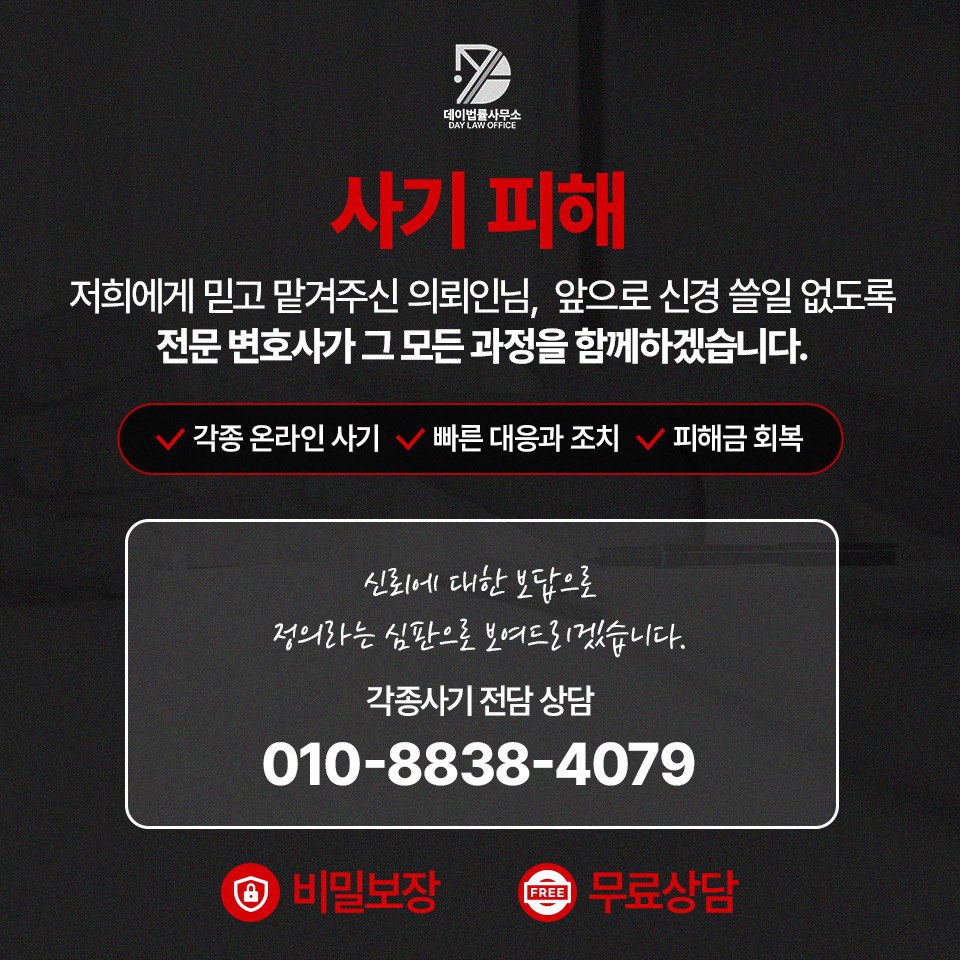 DAY 법률사무소 전담팀은 피해자 상담 → 증거 수집 → 계좌 추적 → 법적 조치까지 일괄적으로 처리해, 심리적으로 위축된 피해자들이 빠른 시간 안에 대응할 수 있도록 지원하고 있습니다.